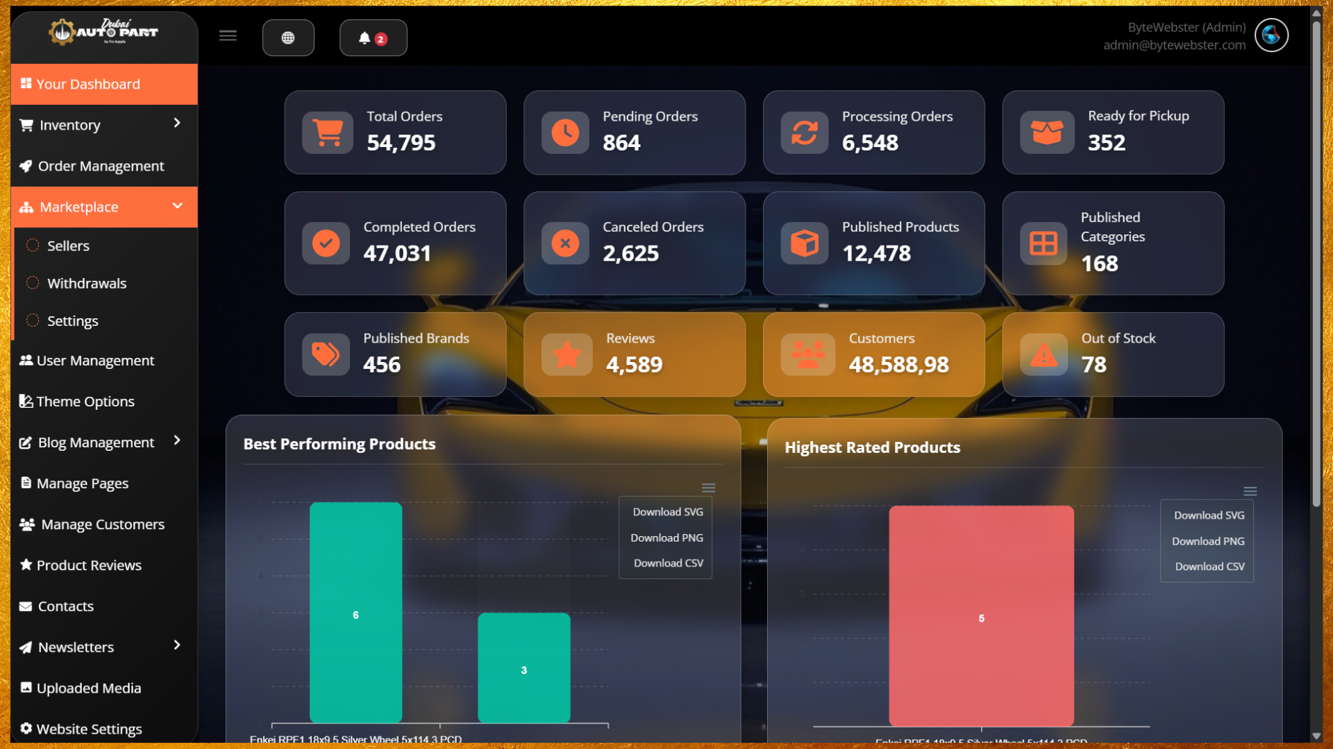 The inventory management system handles bulk uploads via CSV, real-time stock synchronization across vendors, automated low-stock alerts, and product categorization that makes sense for auto parts (unlike generic e-commerce categories). Each vendor gets their own dashboard with isolated permissions - they manage their inventory and orders without seeing other vendors' data.