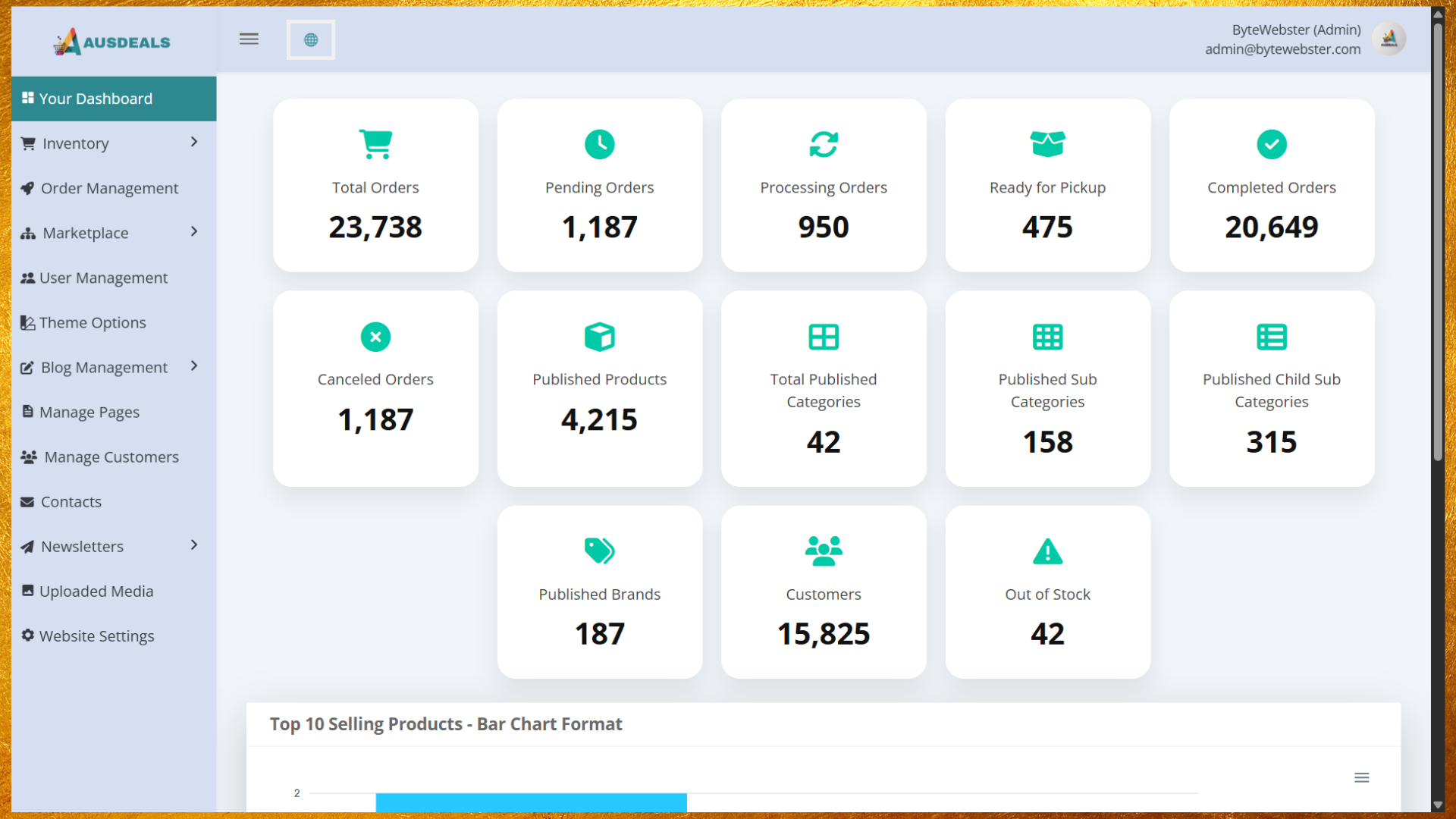 We architected a three-tier marketplace with clear separation of concerns. The admin panel provides inventory oversight, vendor approval workflows, order tracking across sellers, integrated CMS for SEO content, and analytics to spotlight top-performing vendors and products.